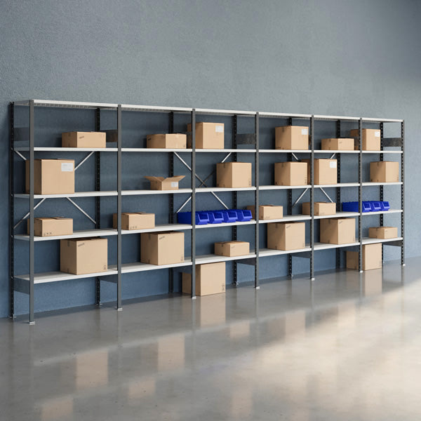 Lagerreol V06 2100x6000x400. Levereres komplet med 14 stolper med fod, 14 tværplader, 3 rygkryds og 30 hylde med hyldekroge. Mørkegrå stolper, RAL 7012 og hylder i lysegrå RAL 7035.