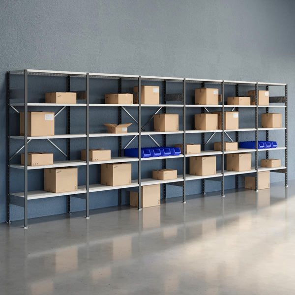 Lagerreol V06 2100x6000x500. Levereres komplet med 14 stolper med fod, 14 tværplader, 3 rygkryds og 30 hylde med hyldekroge. Mørkegrå stolper, RAL 7012 og hylder i lysegrå RAL 7035.