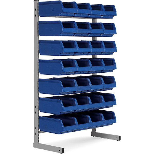 Lagerreol med plastkasser. Enkelsidet bestående af L-gulvstativ med højde 1850 mm, nødvendige ophængsskinner og følgende blå plastkasser: 28 stk 9073, dxbxh = 350x206x150mm.
