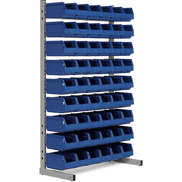 Lagerreol med plastkasser. Enkelsidet bestående af L-gulvstativ med højde 1850mm, nødvendige ophængsskinner og følgende blå plastkasser: 54stk 9074, dxbxh = 250x148x130mm.