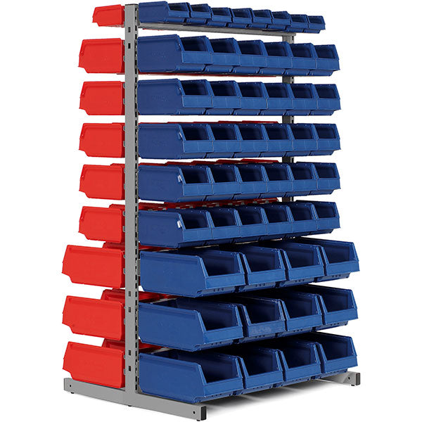 Lagerreol med plastkasser. Dobbeltsidet bestående af T-gulvstativ med højde 1850 mm, nødvendige ophængsskinner og følgende plastkasser: 24 stk. 9073, dxbxh = 350x206x150mm / 60 stk. 9074, dxbxh = 250x148x130mm / 16 stk. 9075, dxbxh = 170x105x75mm.