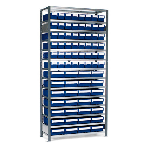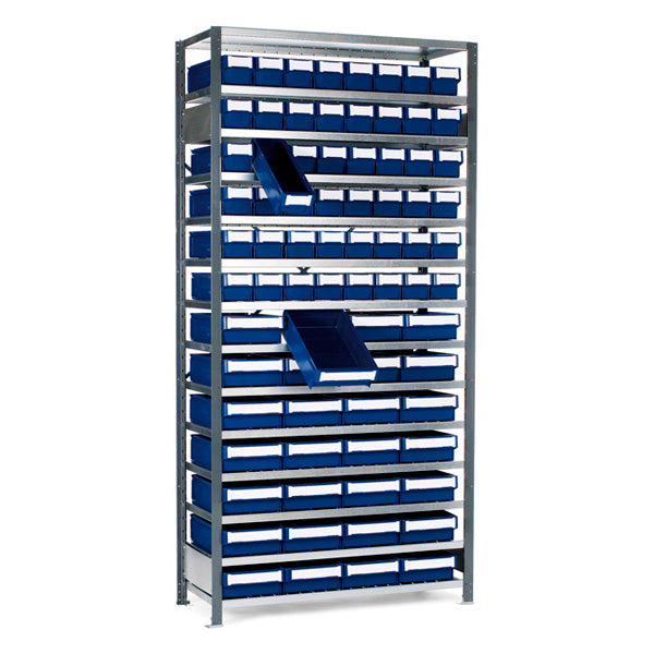 Reolen indeholder 28 stk. blå plastkasser (230 x 100 mm) og 48 stk. blå plastkasser (115 x 100 mm) samt etiketter til mærkning.