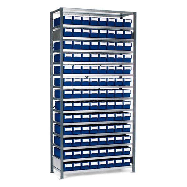 Reol med plastkasser til smådele, som består af en V06 lagerreol med en højde på 2100 mm og 14 hylder. Reolen er indrettet med 104 x 2121, blå plastkasser med b x h = 115 x 100 mm. Etiketter til mærkning af plastkasser medfølger.