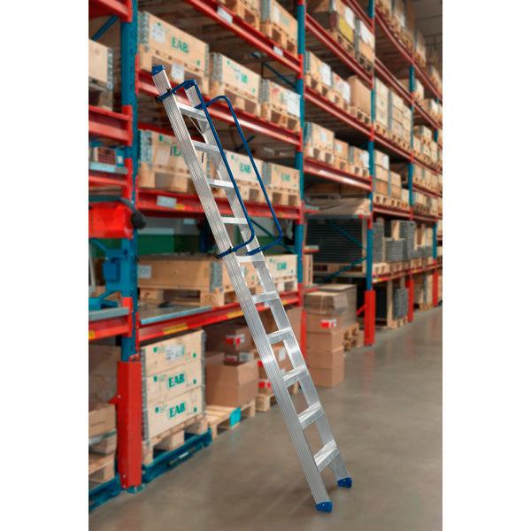 Lagerstige som kan benyttes til pallereoler, lagerreoler osv. De topmonterede kroge hænges på en bærebjælke (pallereol). Ophængskrogene frigør gulvplads, når stigen ikke benyttes. Øvre og nedre tværstag bidrager til øget stabilitet.