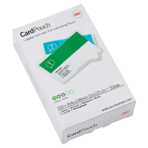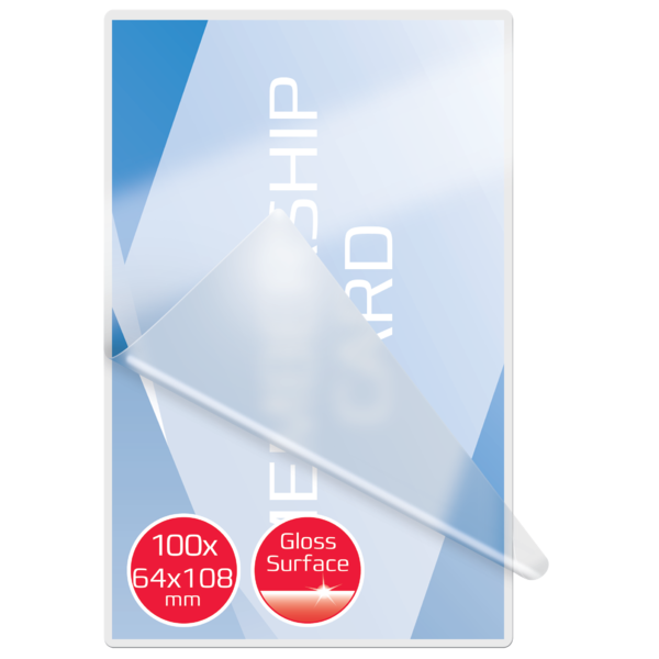 En serie lamineringslommer specielt designet til en række formål som til besøgskort, kørekort og reklamemateriale. 64x108mm. 125 micron skinnende. Pakkestørrelse: 100.