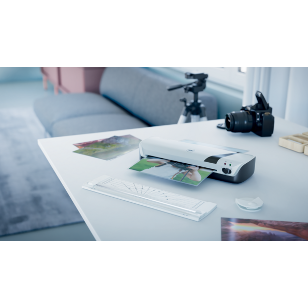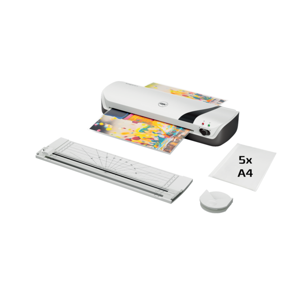 - Sættet indeholder: 1x GBC Inspire+ A4-lamineringsmaskine (hvid), 1x hjørneafrunder til at trimme skarpe kanter og hjørner, 1x rulleskærer til nemt og sikkert at skære dokumenter til den ønskede størrelse, startpakke med 5x lamineringslommer (75 micron - varenr.3740400).