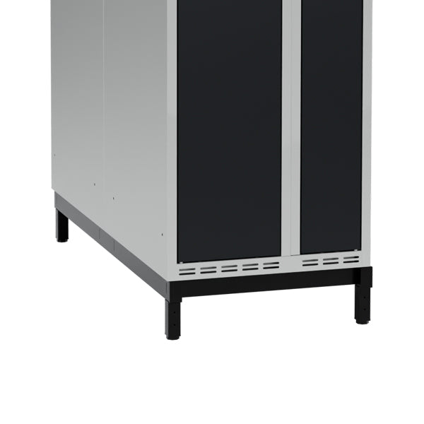 Understellet er tilpasset skabe med en dybde på 550 mm og en bredde på 500 mm, og er beregnet til to skabe placeret ryg mod ryg i dobbeltrække.