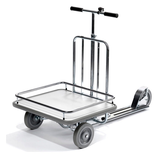 Løbehjul model 86 med et lad på 680 x 580 mm i plastlaminat kantet med beskyttelsesliste, ruller meget nemt og har en lille svingradius samt stabil styring. Udstyret med 3 ø 200 x 46 mm kuglelejrede gummihjul. Den effektive fodbremse virker på baghjulet og sørger for, at begge hænder er fri. Ringeklokke medfølger.Specifikationer:
