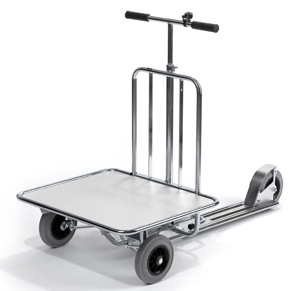 Løbehjul model 87 med et lad på 680 x 580 mm i plastlaminat kantet med beskyttelsesliste, ruller meget nemt og har en lille svingradius samt stabil styring. Udstyret med 3 ø 200 x 46 mm kuglelejrede gummihjul. Den effektive fodbremse virker på baghjulet og sørger for, at begge hænder er fri. Ringeklokke medfølger. Vognen har hjul med kuglelejer og en enkel ramme af rør rundt om ladet.Specifikationer: