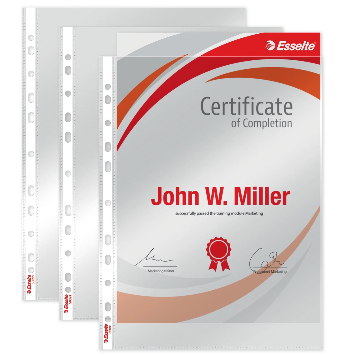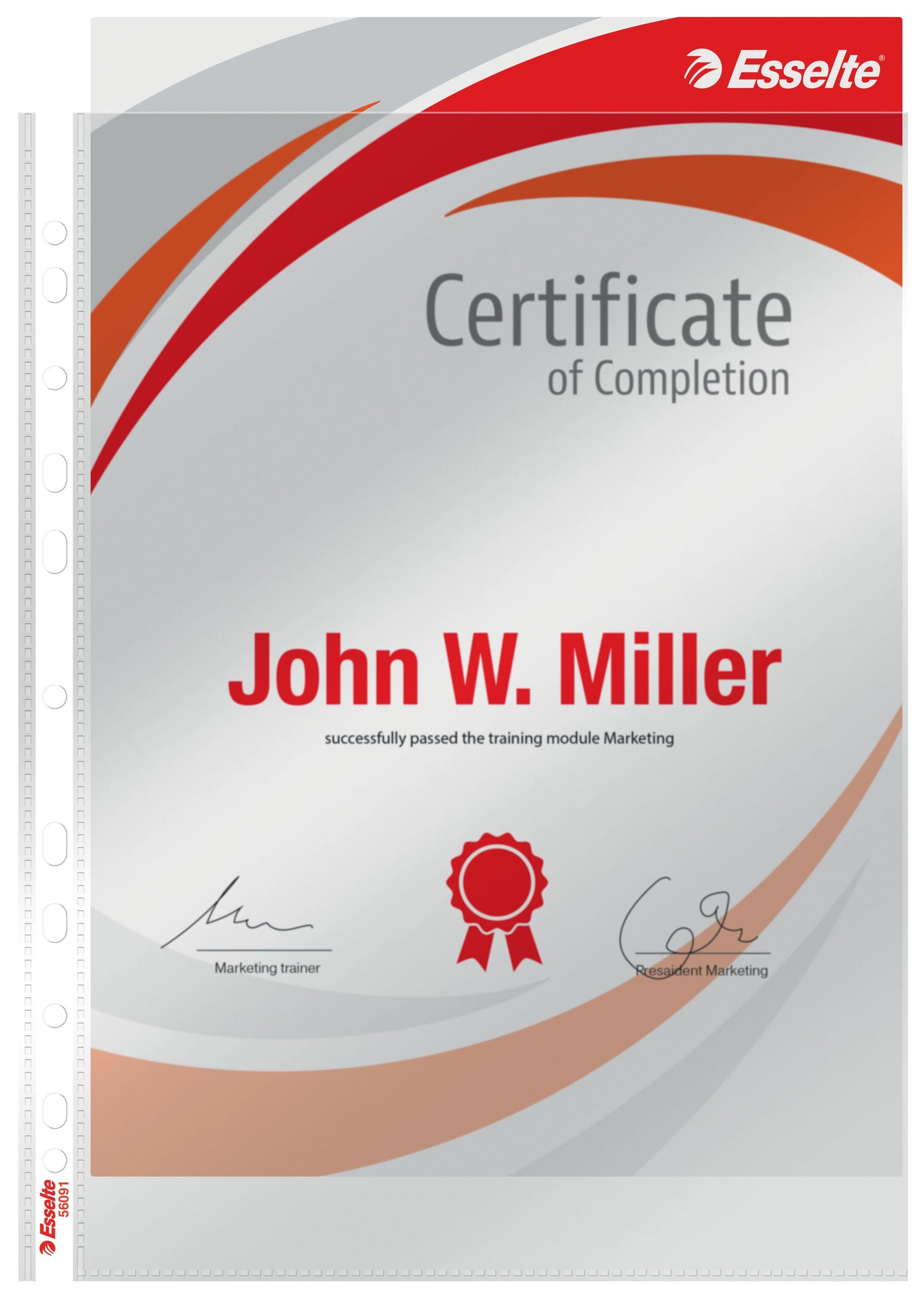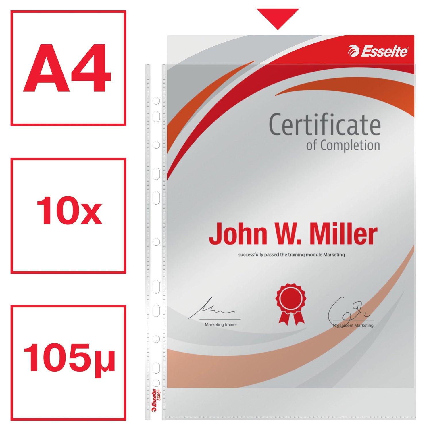 Stærk lomme til konstant daglig brug. Nem opbevaring af dokumenter i brev- og ringordnere- Glasklar 0.105 mm recirkuleret PP folie, copysafe- Åbning i toppen giver nem adgang til papirer uden at åbne mappemekanismen- 11 huller til universal brug- Til A4 format