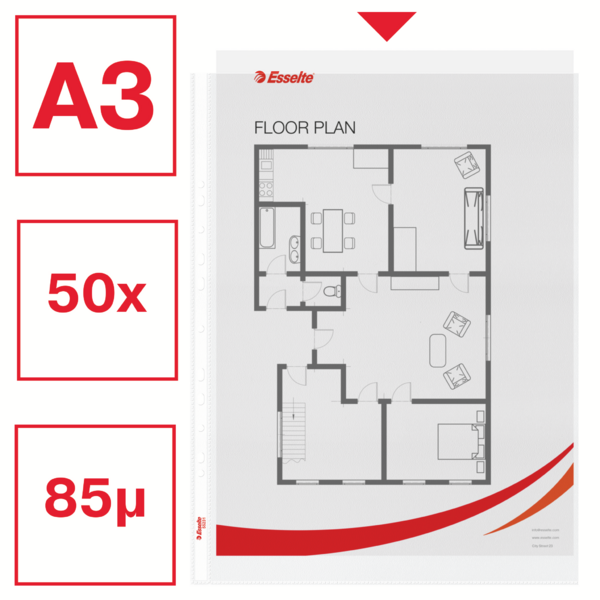 Lomme med en klar, mat finish perfekt til opbevaring og præsentation af A3-tegninger, planer og plakater. Den åbner i toppen for nem adgang til dokumenter og er lavet af slidstærk 85 mikron PP-plast med 30% præ-consumer indhold, hvilket gør den 100% recirkulerbar.