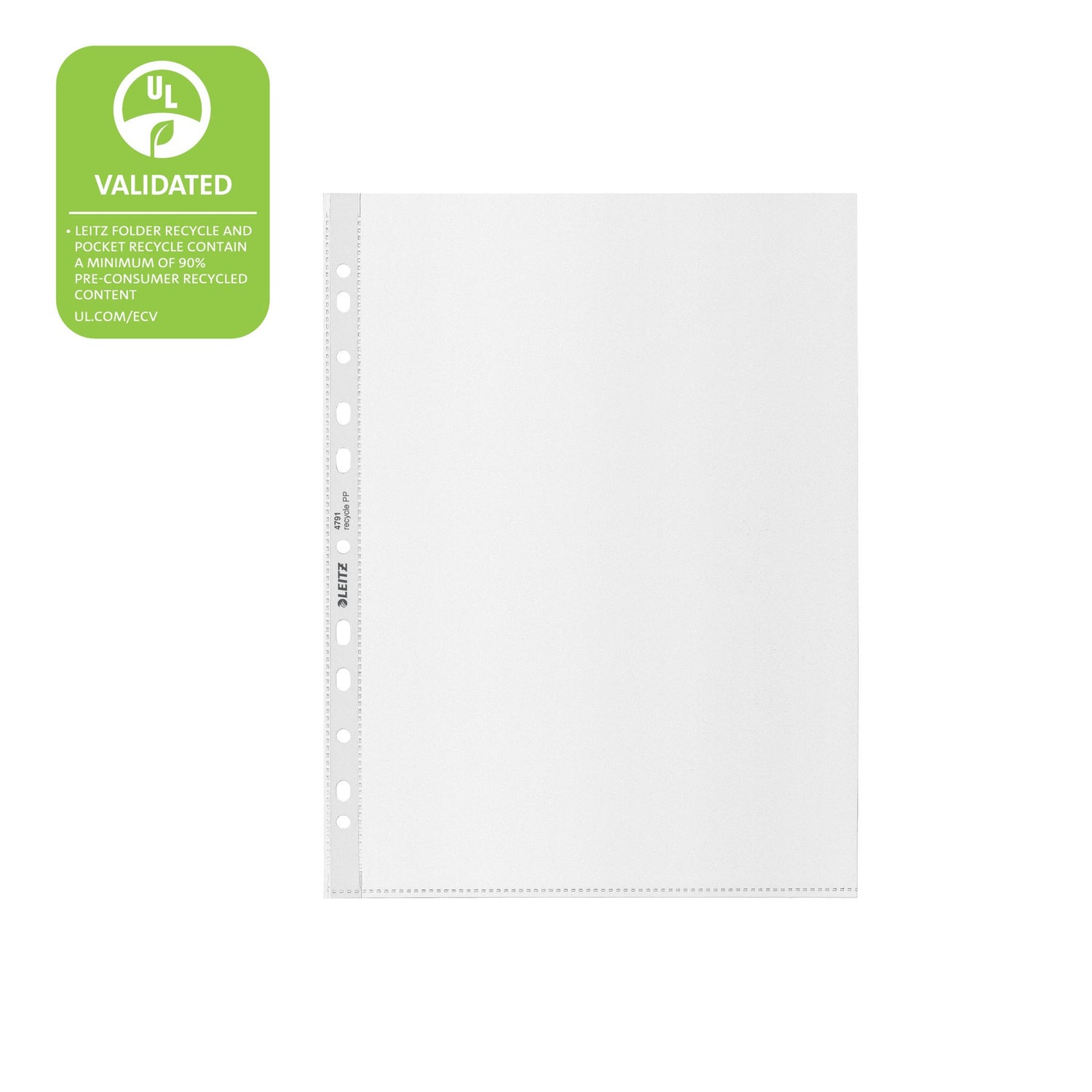 Iøjnefaldende A4 lomme i premium kvalitet til at beskytte dokumenter på farten og organisere papirer på arbejde og hjemme. Multihulning giver nem arkivering af dokumenter i brevordnere og ringordnere Fremstillet af 90% (præ-consumer) recirkuleret plast, eksternt revideret og certificeret af UL og 100% recirkulerbar. Denne stærke og praktiske klare plastlomme komplementerer perfekt andre produkter fra Leitz Recycle-serien og er lavet til at holde. Moderne og stilfulde kontorartikler, som vil passe ind på kontoret og i hjemmet. - Fremstillet af 90% (præ-consumer) recirkuleret plast, eksternt revideret og certificeret af UL - Beskyttende A4-plastlommer til arkivering og opbevaring af A4-dokumenter - Slidstærkt og holdbar ikke-giftig plast (PP) af premium kvalitet, sikrer, at du kan genbruge gang på gang - 11-hullers universal forstærket hulkant til brug i enhver brev- eller ringordner. Forstærkningen er lavet af klar genanvendt folie - Præget overflade med folie af høj kvalitet
