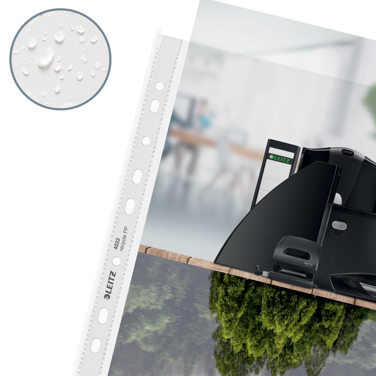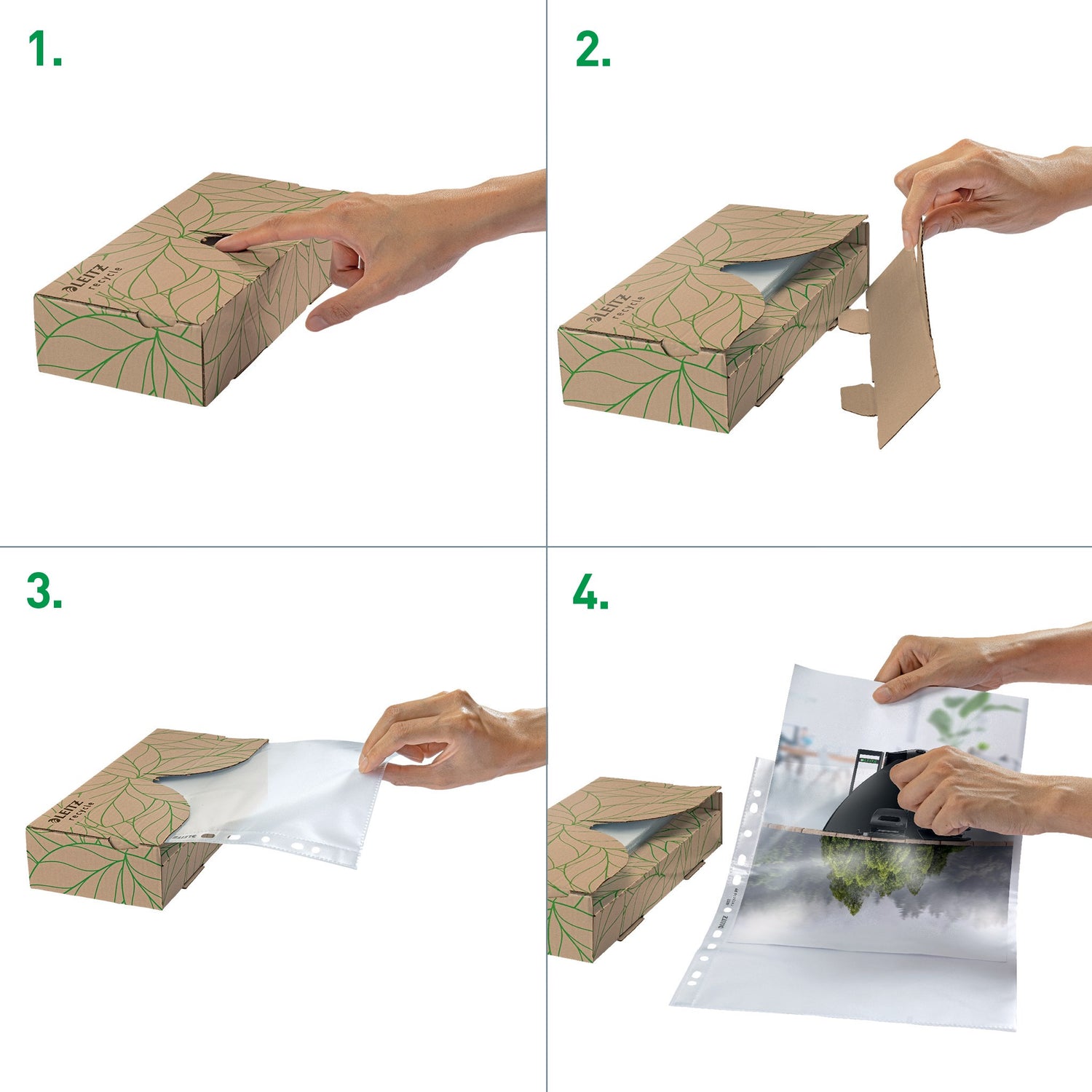 Iøjnefaldende A4-dokumentlomme i høj kvalitet til beskyttelse af dokumenter på farten og til organisering af papirer på arbejdet og derhjemme. Den serviet boks-lignende dispenser leverer bekvemt plastlommer en ad gangen. Multihulning giver nem arkivering af dokumenter i brevordnere og ringordnere. Fremstillet af 100% recirkuleret plast (præ-consumer) og 100% recirkulerbar. Denne stærke og praktiske lomme i præget plast passer perfekt til andre produkter fra Leitz Recycle-serien og er lavet til at holde længe. Æsken er fremstillet af 100% pap og er fuldt recirkulerbar. Moderne og stilfulde kontorartikler, som vil passe ind på kontoret og i hjemmet. - Fremstillet af 100% recirkuleret (præ-consumer) plast, 100% recirkulerbare - Den innovative dispenserboks med attraktivt emballagedesign leverer bekvemt plastlommer en ad gangen og holder de andre lommer på plads, pladsbesparende, så de passer ind i skuffer eller på hylder - Beskyttelseslommer i A4-plast med åbning i toppen til arkive