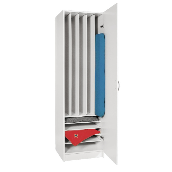 Madrasskab Slumra med kabinet og dør i hvid laminat. Plads til 5 madrasser og 5 puder. Pudehylden kan placeres oppe eller nede. Døren er højrehængslet.
