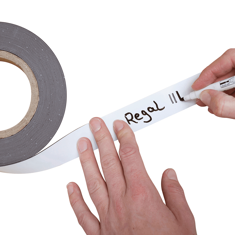 Magnetbåndet har en plastbelagt overflade, der kan skrives på med whiteboardmarker eller tusch, og teksten kan let tørres af igen.