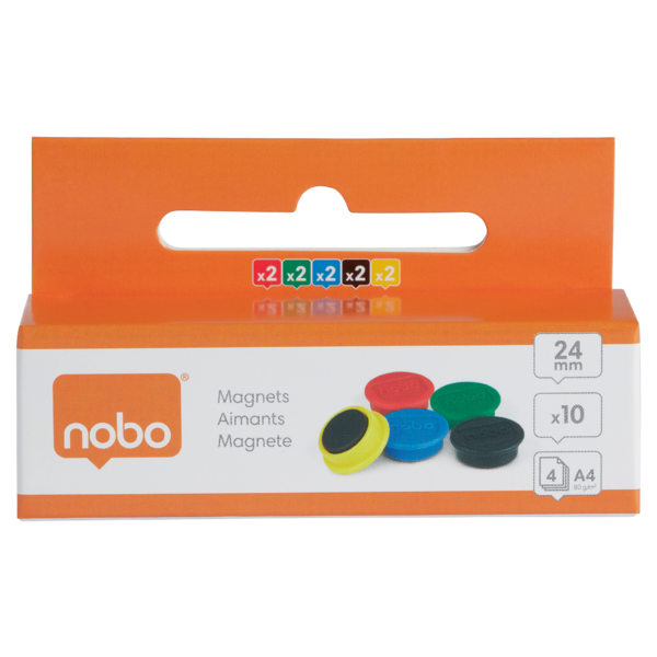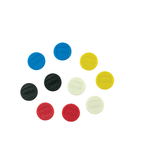 Runde magneter er det perfekte værktøj til at vise og visualisere ideer til fælles brainstorming på magnetiske whiteboards eller bruge som køleskabsmagneter til at fastgøre påmindelser og vigtige beskeder pænt derhjemme. Disse farvede magneter holder 4 x 80 A4-ark sikkert og er 24 mm i diameter. Magnetstyrke 300g, pakke med 10 assorterede magneter (2 x rød, 2 x grøn, 2 x blå, 2 x sort, 2 x gul)