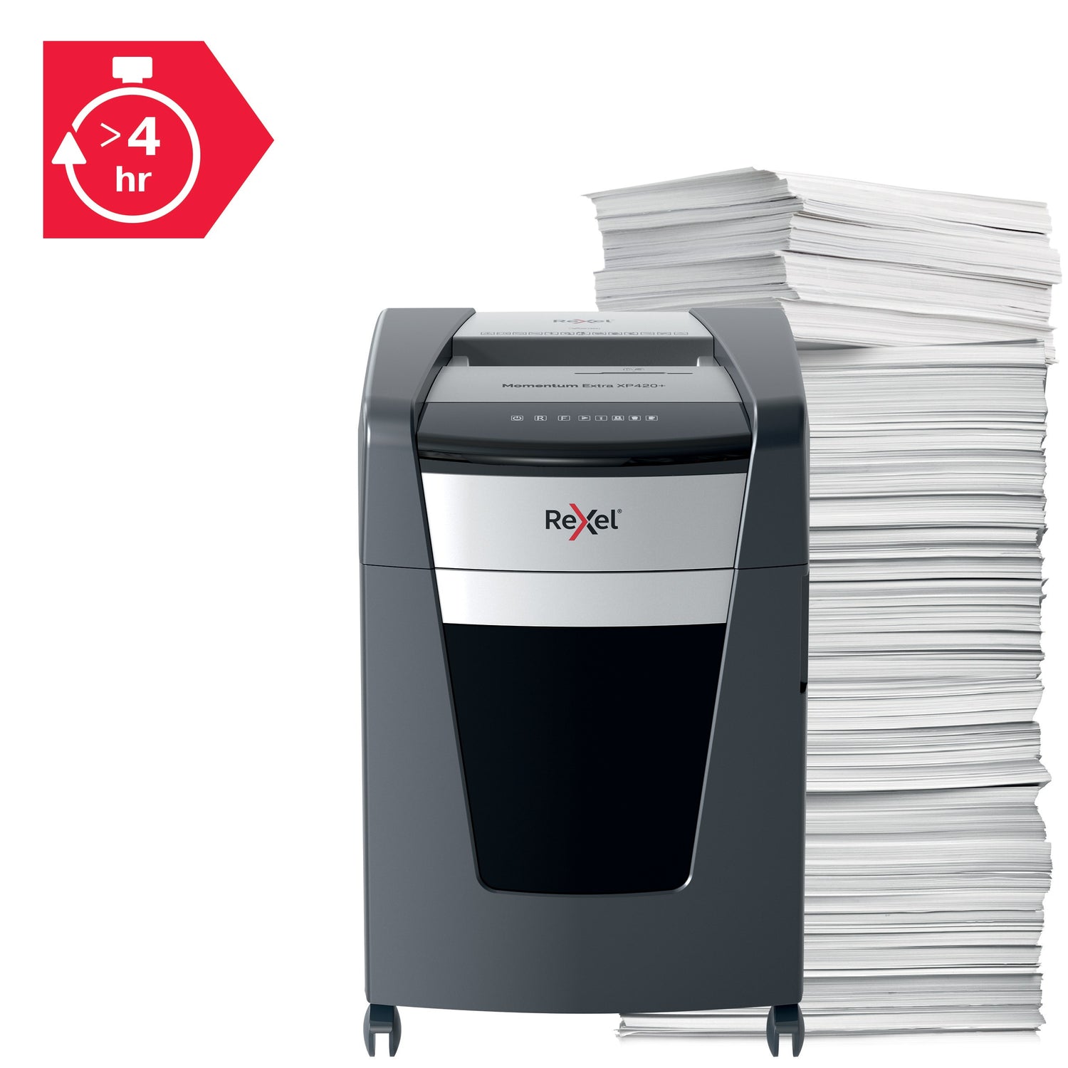 Rexel Momentum Extra makulatorer uden papirstop er ideelle til destruktion af fortrolige dokumenter på kontoret. XP420+ makuleringsmaskinen makulerer op til 20 ark A4-papir (80g) på én gang gennem den manuelle indføringsspalte til P-4 (4x35 mm) krydsmakuleringsstykker. Aktiv sensorteknologi måler antallet af ark, der føres ind i realtid for at forhindre papirstop og fejlindføring