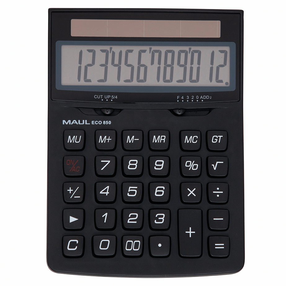 MAUL ECO 850 er en praktisk regnemaskine til skrivebordet fra den tyske producent MAUL. Den store, vinklede 12-cifrede LCD-skærm sikrer høj læsbarhed. Regnemaskinen fungerer allerede ved blot 50 lux, hvilket gør den særligt energibesparende i almindeligt kontorlys.