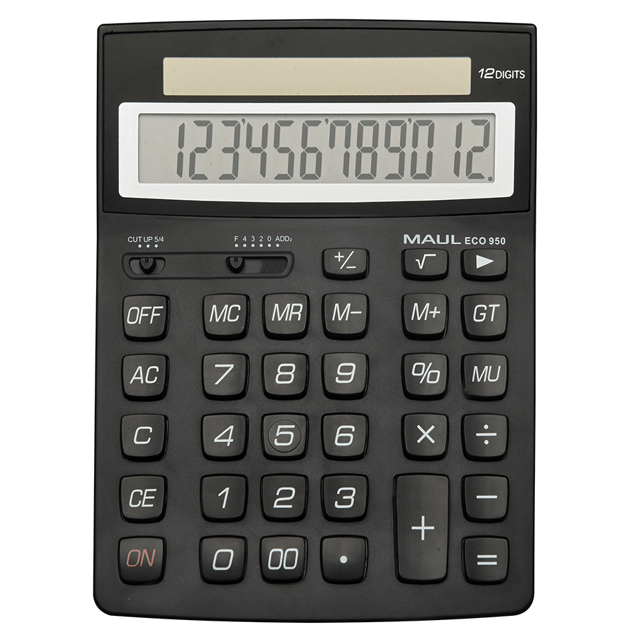 MAUL regnemaskine ECO 950 er en effektiv regnemaskine i XL-format, som er skabt til dig, der ønsker maksimal funktionalitet. Den ekstra store 12-cifrede LCD-skærm, det skråtstillede display og de store plasttaster giver en høj grad af ergonomi og læsbarhed – både ved skrivebordet og på farten.