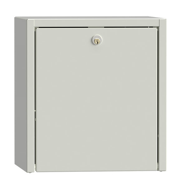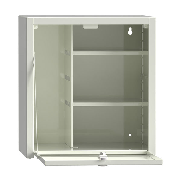 Medicinskab med to flytbare hylder og en skillevæg til vægophæng. Den venstre del rummer en A4 ringbind. Farve hvid, RAL 9003. Cylinderlås. Mål (hxbxd): 380x350x310 mm.