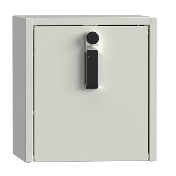 Medicinskab med to flytbare hylder og en skillevæg til vægophæng. Skabet er udstyret med en elektronisk lås, Assa Sense+, der har logfunktion.Den venstre del rummer en A4 ringbind. Farve hvid, RAL 9003. Mål (hxbxd): 380x350x310 mm.