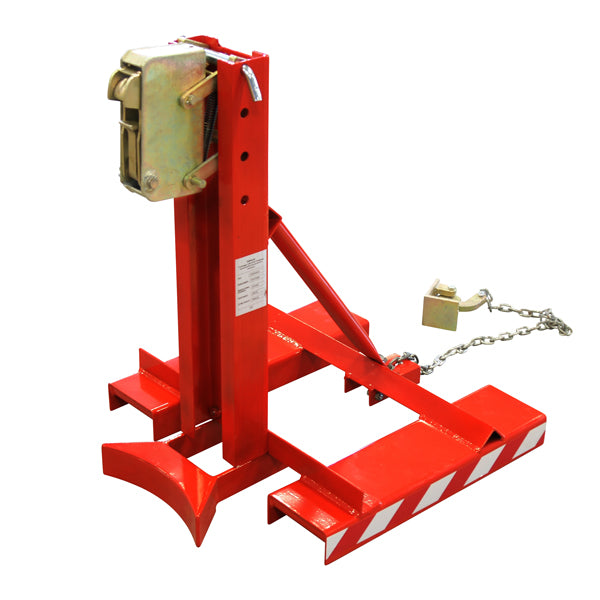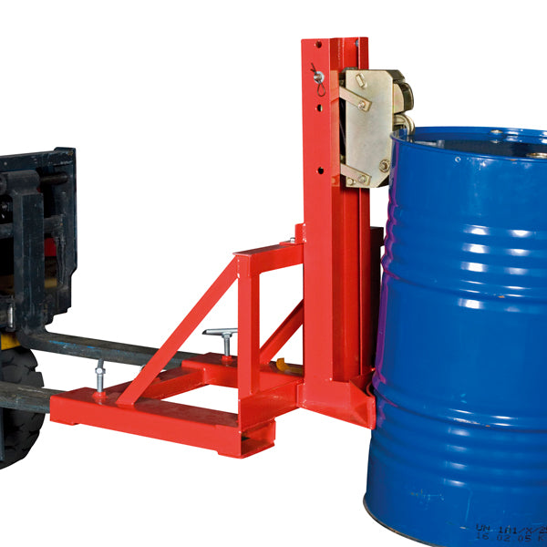 Mekanisk tøndeløfter med en kapacitet på 360 kg, til løft og transport af en ståltønde med gaffeltruck. Enheden placeres ganske enkelt på truckens gafler og låses med en kæde. Tøndeløfteren griber automatisk fat i tønden og holder den sikkert på plads under transport. Løfteren kan justeres i højden, så den passer til alle størrelser ståltromler.
