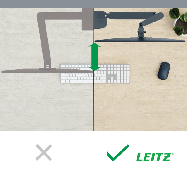Leitz pladsbesparende single monitor arm med TÜV og IGR certificering har en positiv indvirkning på kropsholdningen, fremmer korrekt øjenjustering og understøtter nakke- og skulderkomfort, når skærmens højde justeres korrekt, og som anbefalet, til den ideelle ergonomiske position. Skærmholderen forbliver stabilt i alle højder og vinkler og kan nemt skiftes mellem liggende og stående tilstand. Designet er ideelt til steder, hvor pladsen er trang, og det frigør værdifuld plads på skrivebordet takket være de ultra fleksible arme, som nemt kan foldes flat, vippe, og bevæges i enhver retning ved brug af én hånd. Ergonomisk designet til at fremme velvære og øge produktiviteten.