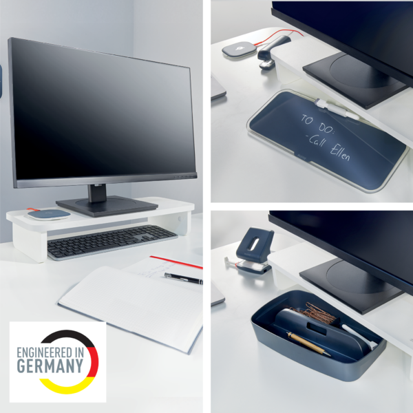 Leitz Ergo monitor stand hæver din skærm for at øge din synskomfort, og for at forbedre din kropsholdning. Ved at bruge en monitor stand, kan du også holde dit skrivebord organiseret og frit for rod, da den giver opbevaring til dit tastatur og andre daglige fornødenheder. Med sit minimalistiske design og matte finish vil denne stilfulde monitor stand forbedre sundhed og velvære, ved ubesværet at skabe den perfekte aktive arbejdsopsætning. Kombiner med andre Leitz Ergo produkter for at skabe en indbydende og fleksibel arbejdsplads, der holder dig i bevægelse hele dagen.