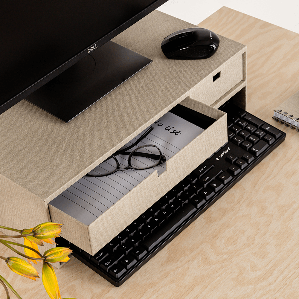 Monitor Stand / skærmhylde til computerskærm, i naturfarvet, lamineret kanvas. Denne smarte og praktiske monitor stand bruges til at hæve computerskærmen op i behagelig arbejdshøjde på skrivebordet, samtidig med at der er opbevaringsplads til tastatur i rummet under og 2 skuffer til opbevaring. Skærmhylden hjælper med at holde orden på skrivebordet, og passer til resten af vores skrivebordsserie. Brug den til at skabe struktur med stilfuld opbevaring af ting du bruger på kontoret. Foruden plads til at gemme kabler og tastatur under skærmhylden, er der også 2 skuffer til opbevaring af ting, så skrivebordet er nemt at holde ryddeligt. Den store skuffe kan f.eks. indeholde A4 papir, blokke og andre lidt større ting, mens den lille skuffe er smart til opbevaring af småting, clips m.v. En perfekt skrivebordsløsning med plads til det der praktisk lige at have ved hånden på skrivebordet. Skrivebordsserien er fremstillet af genanvendte fiberplader og beklædt med lamineret kanvas. Farven er en flot natur / linen. De øvrige skrivebords produkter i serien finder du HER. Størrelse: Bredde 48,5 cm. Dybde 26 cm. Højde 14,5 cm.Opgrader dit arbejdsområde med denne stilfulde og funktionelle skærmhylde i genanvendte materialer. Den er ikke bare god for din holdning, men også for dit arbejdsmiljø med sin rummelige og organiserede opbevaring. Bestil nu for et mere komfortabelt og ryddeligt kontor. Denne skærmhylde er ikke bare et møbel, det er en investering i dit velbefindende på arbejdspladsen.