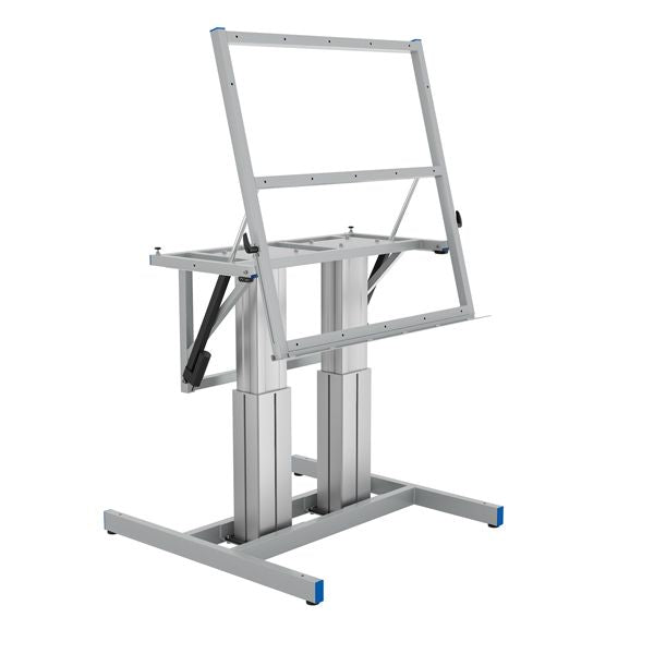Et komplet motordrevet CE-mærket vinklingsbart montagebord med 2-søjlet stel, arbejdsfladen kan vippes op til 75º. Arbejdsfladen kan forlænges med 315 mm ved at flytte forkantlisten. Forkantlisten kan fungere som støtte eller som hylde til værktøj, men produkter på det SKAL skrues fase ind i bordrammen eller i bordpladen. Regulering af arbejdshøjde og vinkling sker med håndbetjeninger placeret til højre eller venstre side af stativet. Dette vippebord er tænkt som et ergonomisk og rationelt monteringsbord. Alle bordstativets ståldele er fuldsvejste og bordet er meget stabilt. Montagebordet leveres færdigmonteret og funktionstestet. leveret på en EUR palle. Ekskl. bordplade. Hjulsæt fås som tilbehør varenummer 624802.