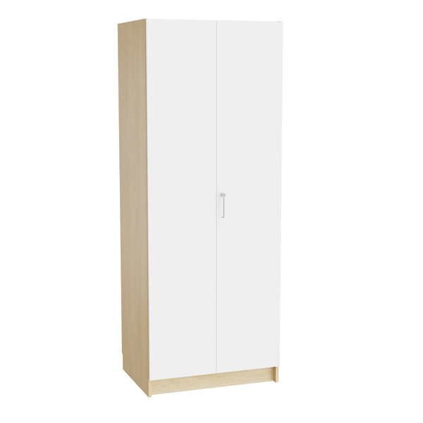 Mora Højskab, i birk laminat udførelse med døre i hvid laminat. Størrelsen på højskabet er (h x b x d) 2100 x 800 x 600 mm. Højskabet har to faste og tre flytbare hylder. Dørene leveres med cylinderlås og skabene leveres færdig monteret, inkl. sokkel. 2 stk nøgler pr lås.Specifikationer: