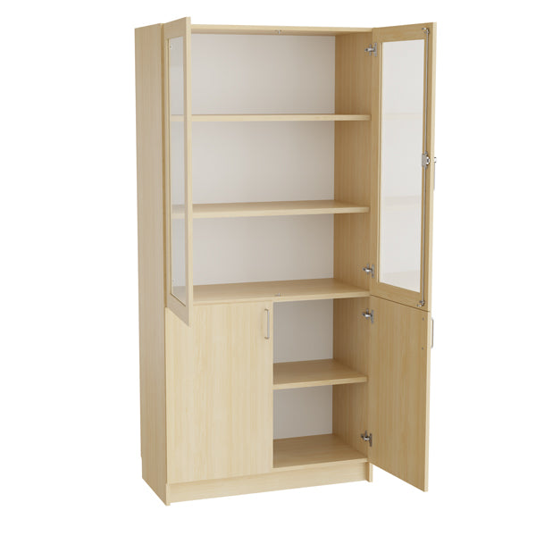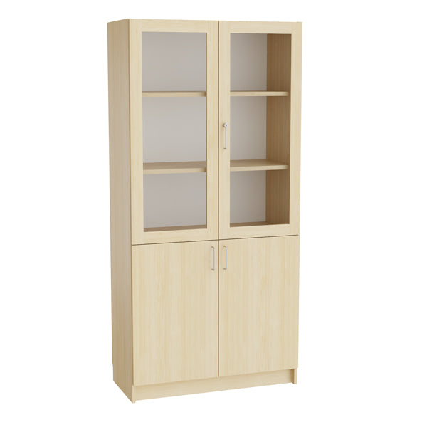Mora Højskab kombi, i birk laminat udførelse med døre i birk laminat/sikkerhedsglas. Størrelsen på højskabet er (h x b x d) 2100 x 1000 x 470 mm. I skabets øverste del er der to flytbare hylder, i nederste del en flytbar hylde. Dørene leveres med cylinderlås og skabene leveres færdig monteret, inkl. sokkel.Specifikationer: