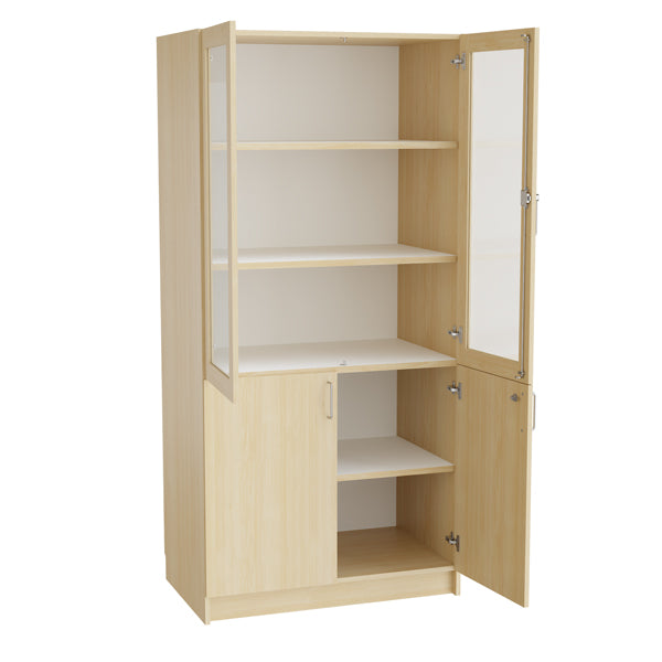 Mora Højskab kombi, i birk laminat udførelse med døre i birk laminat/sikkerhedsglas. Størrelsen på højskabet er (h x b x d) 2100 x 1000 x 600 mm. I skabets øverste del er der to flytbare hylder, i nederste del en flytbar hylde. Dørene leveres med cylinderlås og skabene leveres færdig monteret, inkl. sokkel. 2 stk nøgler pr lås.Specifikationer:
