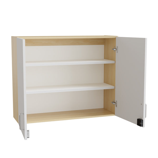 Væghængt overskab i birk laminat med grå laminat døre. Overskabet har størrelse (h x b x d) 800 x 800 x 320 mm, leveres med RFID system i dørene og har to hyldeplan.Specifikationer: