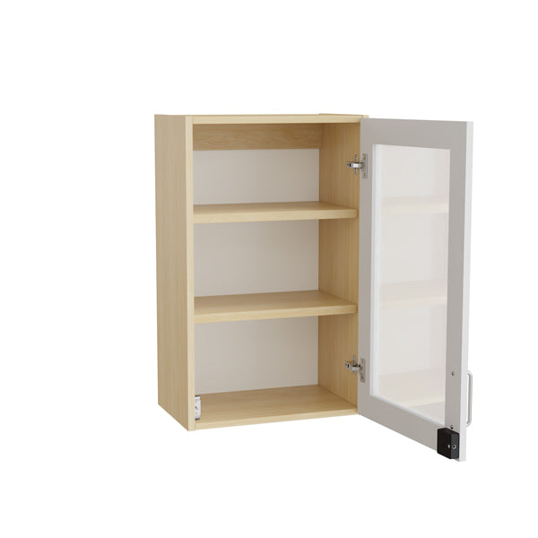 Væghængt overskab i birk laminat med grå laminat/sikkerhedsglas døre. Overskabet har størrelse (h x b x d) 800 x 500 x 320 mm, leveres med RFID system i dørene og har to hyldeplan.Specifikationer: