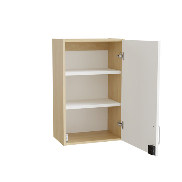Væghængt overskab i birk laminat med hvid laminat døre. Overskabet har størrelse (h x b x d) 800 x 500 x 320 mm, leveres med RFID system i dørene og har to hyldeplan.Specifikationer: