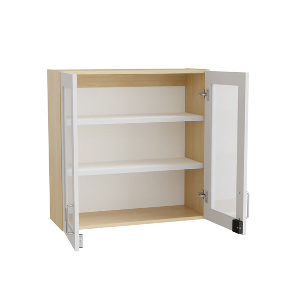 Væghængt overskab i birk laminat med grå laminat døre. Overskabet har størrelse (h x b x d) 800 x 800 x 320 mm, leveres med RFID system i dørene og har to hyldeplan.Specifikationer: