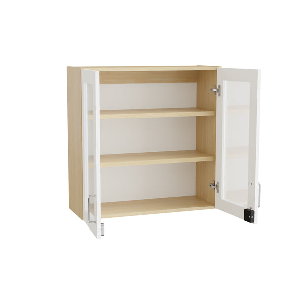 Væghængt overskab i birk laminat med hvid laminat døre. Overskabet har størrelse (h x b x d) 800 x 800 x 320 mm, leveres med RFID system i dørene og har to hyldeplan.Specifikationer: