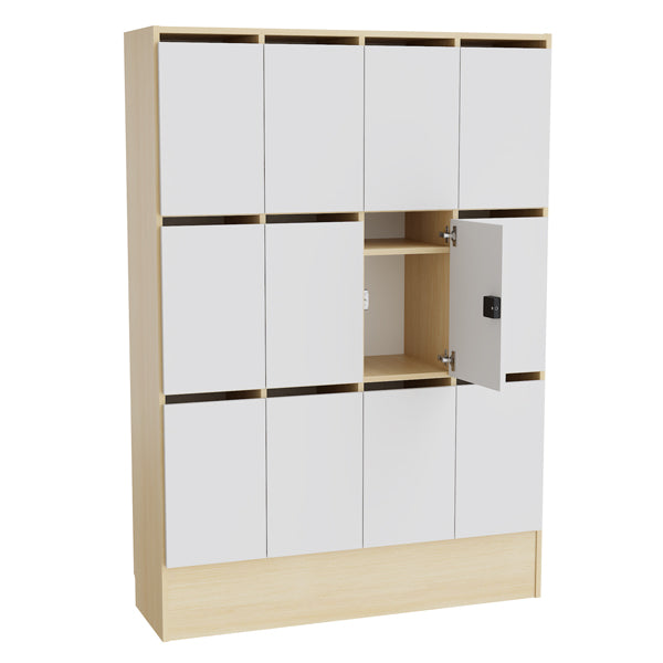Mora Personaleskab med 12 rum, i birk laminat udførelse med døre i grå laminat. Størrelsen på personaleskabet er (h x b x d) 1780 x 1242 x 400mm. Dørene leveres med RFID systemlås og skabene er færdig monteret, inkl. sokkel.Specifikationer: