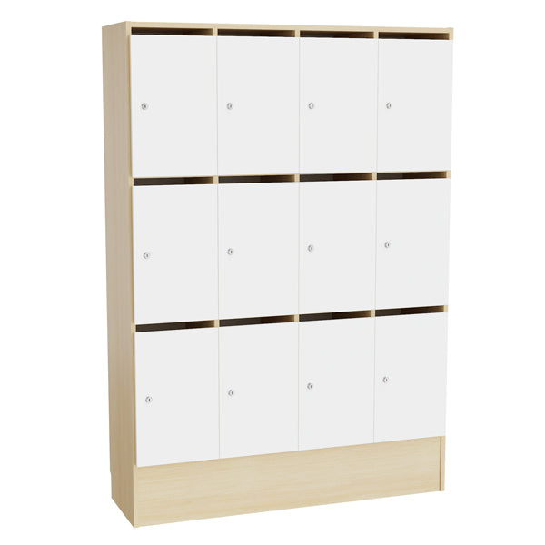 Mora Personaleskab med 12 rum, i birk laminat udførelse med døre i hvid laminat. Størrelsen på personaleskabet er (h x b x d) 1780 x 1242 x 400mm. Dørene leveres med cylinderlås og skabene leveres færdig monteret, inkl. sokkel. 2 stk. nøgler pr lås.Specifikationer: