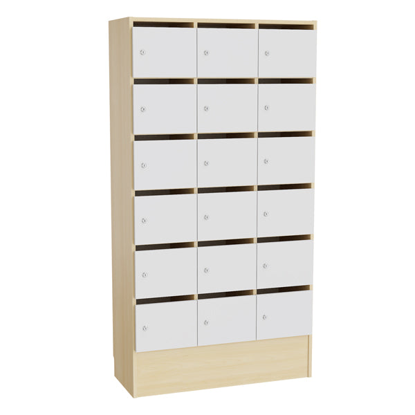 Mora Personaleskab med 18 rum, i birk laminat udførelse med døre i grå laminat. Størrelsen på personaleskabet er (h x b x d) 1780 x 936 x 400mm. Dørene leveres med cylinderlås og skabene leveres færdig monteret, inkl. sokkel.2 stk. Nøgle pr lås.Specifikationer: