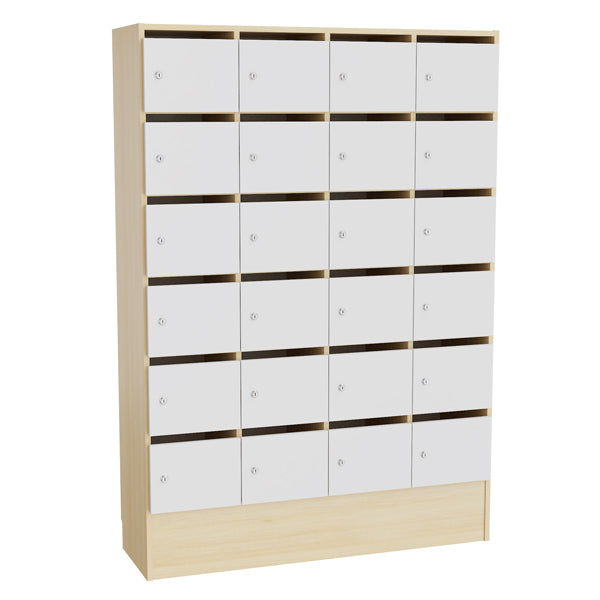 Mora Personaleskab med 24 rum, i birk laminat udførelse med døre i grå laminat. Størrelsen på personaleskabet er (h x b x d) 1780 x 1242 x 400mm. Dørene leveres med cylinderlås og skabene leveres færdig monteret, inkl. sokkel. 2 stk. nøgler pr lås.Specifikationer: