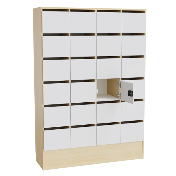 Mora Personaleskab med 24 rum, i birk laminat udførelse med døre i grå laminat. Størrelsen på personaleskabet er (h x b x d) 1780 x 1242 x 400mm. Dørene leveres med RFID systemlås og skabene er færdig monteret, inkl. sokkel.Specifikationer: