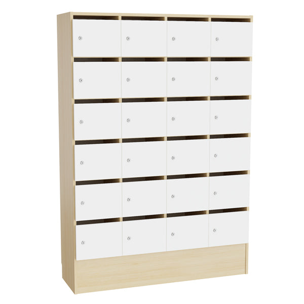 Mora Personaleskab med 24 rum, i birk laminat udførelse med døre i hvid laminat. Størrelsen på personaleskabet er (h x b x d) 1780 x 1242 x 400mm. Dørene leveres med cylinderlås og skabene leveres færdig monteret, inkl. sokkel. 2 stk. nøgler pr lås.Specifikationer: