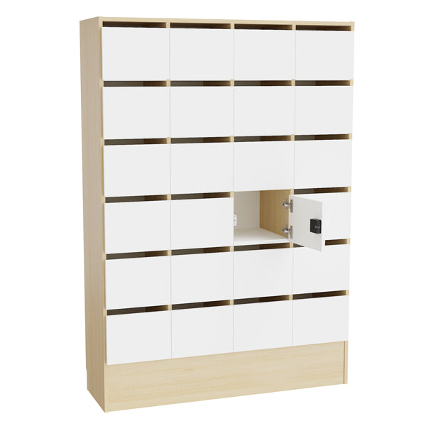 Mora Personaleskab med 24 rum, i birk laminat udførelse med døre i hvid laminat. Størrelsen på personaleskabet er (h x b x d) 1780 x 1242 x 400mm. Dørene leveres med RFID systemlås og skabene er færdig monteret, inkl. sokkel.Specifikationer: