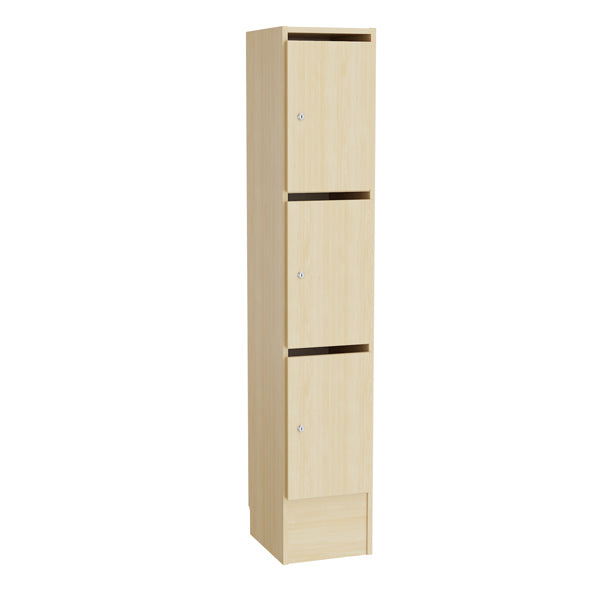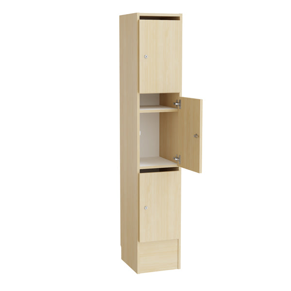 Mora Personaleskab med 3 rum, i birk laminat udførelse med døre i birk laminat. Størrelsen på personaleskabet er (h x b x d) 1780 x 324 x 400 mm. Dørene leveres med cylinderlås og skabene leveres færdig monteret, inkl. sokkel. 2 stk. nøgler pr lås.Specifikationer: