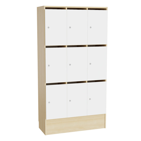 Mora Personaleskab med 9 rum, i birk laminat udførelse med døre i hvid laminat. Størrelsen på personaleskabet er (h x b x d) 1780 x 936 x 400mm. Dørene leveres med cylinderlås og skabene leveres færdig monteret, inkl. sokkel. 2 stk. nøgler pr lås.Specifikationer: