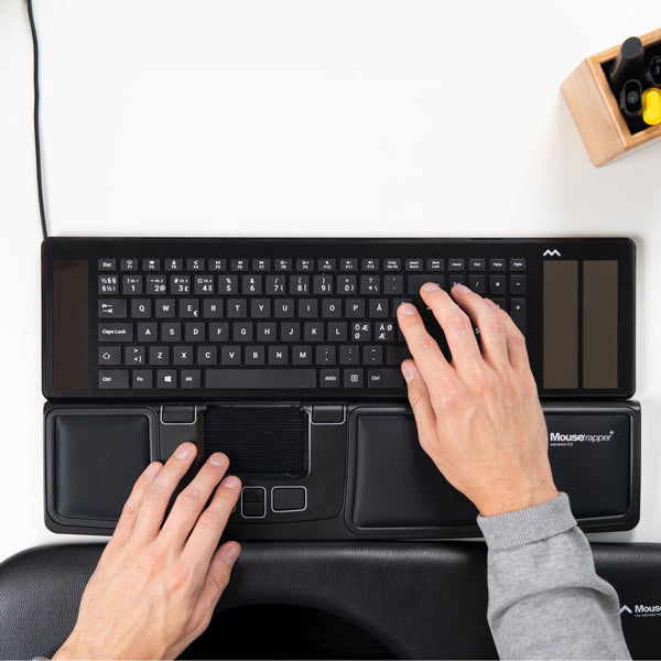 Håndledsstøtterne er udskiftelige, og Mousetrapper Advance 2.0 har også en udfoldelig tastaturunderlag, der passer både til de nye supertynde tastaturer og de højere standardtastaturer.