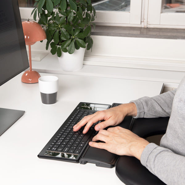 - Ergonomisk design: Placer dine hænder i en naturlig og afslappet position og undgå overbelastning af skuldre, nakke og arme. Den brede og bløde håndledsstøtte giver optimal støtte hele dagen.
