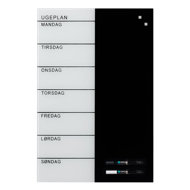 Magnetisk glas uge tavle 40 x 60 cm. Dansk tekst. Skriv på tavlen med en marker, og sæt ting op på den med super stærke magneter. Gør det nemt at planlægge ugens aktiviteter, og brug den anden halvdel af talven til noter eller huskeseddel. Ophæng: Tavlen leveres med skruer, rawlplugs, ophængs skabelon og 2 markere, sort og hvid. Se monteringsvejledning under fanen vejledninger.Denne magnetiske glas uge tavle bliver en uundværlig hjælp i din dagligdag, et funktionelt og designorienteret element, der gør dine udfordringer og opgaver mere overskuelige. Glæd dig over et produkt af høj kvalitet, der giver både struktur og stil til dit hjem eller kontor. Gør orden i planlægningen til en leg med denne praktiske og elegante tavle.